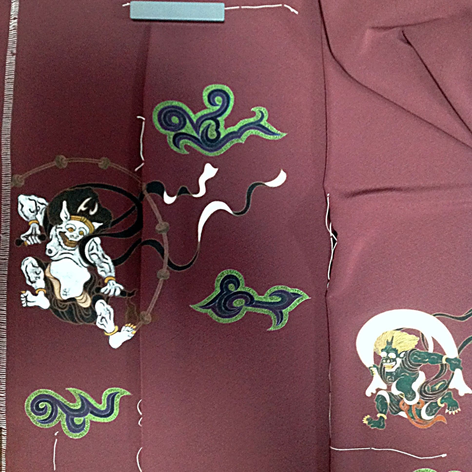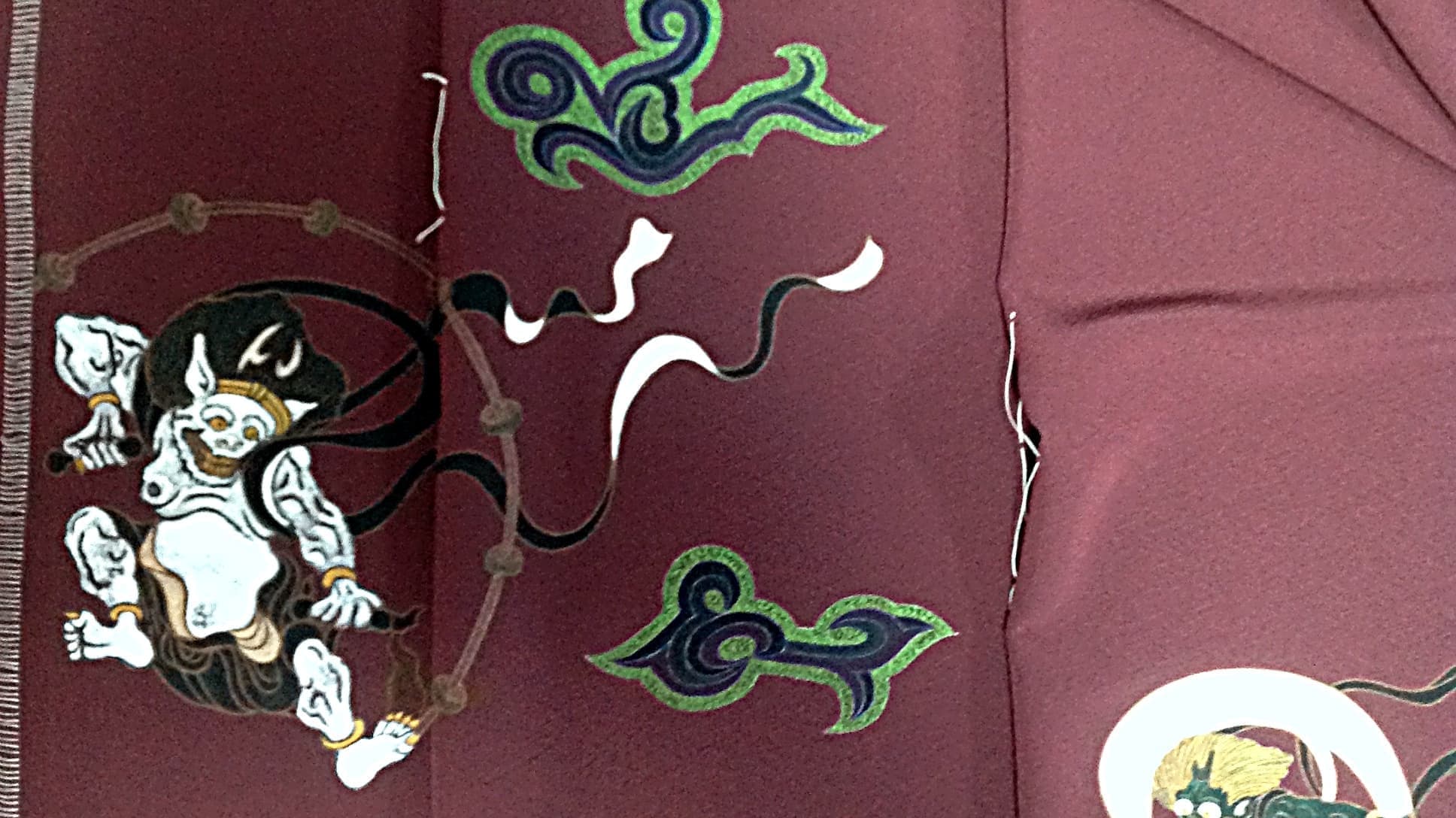 ご依頼いただきましたお客様は、刺繍をこの着物にされるとのことで袖には素晴らしい⾵神と雷神が仕上がっていました。そこから⼿描きで裾などに柄を⾜して欲しいと承りました。