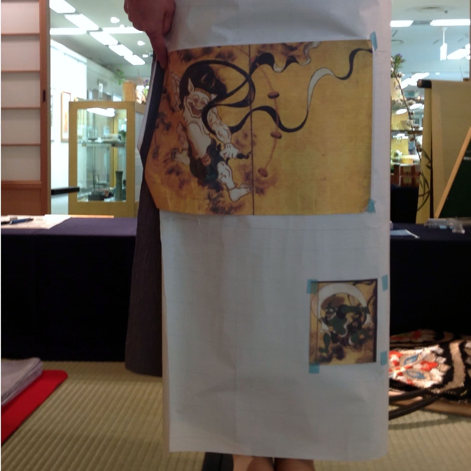 ⼿描き友禅のデザインは、刺繍と同じく「⾵神と雷神、そして雲を描いて欲しい」との事でしたので、紙に書いて頂き、柄の場所や⼤きさを参考にし、染められております絹に直接⼩筆と⼩刷⽑を使い描かせていただきました。